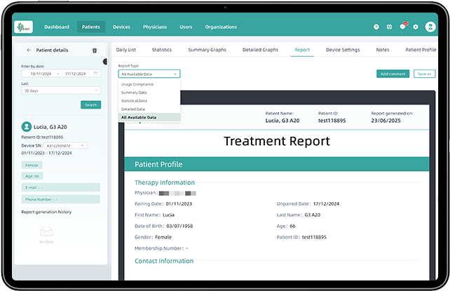 One-click report generation with rich types of Usage Compliance, Statistical Data, Summary Data, Detailed Data, All Available Data and Custom, save more time and pay more care into patients for health professionals.